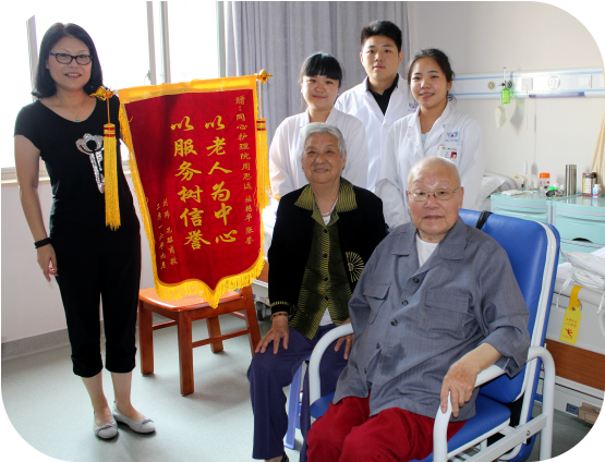 2016年9月23日上午,二病区孔昭甫、刘玮夫妇带着“以服务树信誉,以老人为中心”的锦旗来感谢康复医学科周思远、施艳华、张誉三位康复治疗师。感谢他们精湛的医术,悉心的服务。