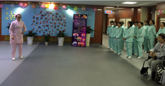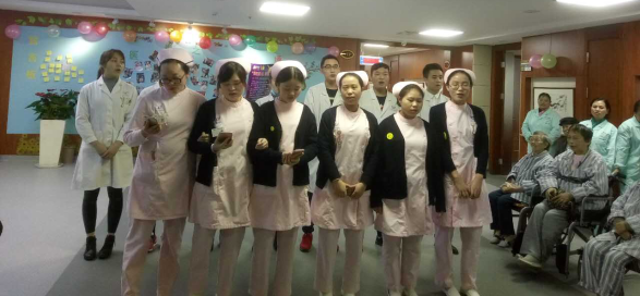 五病区的护士和康复师们也不甘示弱,合唱了一首《外婆的澎湖湾》,会唱的老人也都跟着我们一起合唱,激动不已,掌声不断。