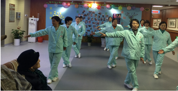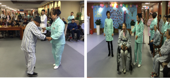 在同心护理院经常可以看到医患同庆,其乐融融,医患一家亲的场景,在这里我们就像亲人一样。 护工阿姨们更多的扮相者老人朋友的角色,陪他们聊曾经很多美好的事情,所以开场舞护工阿姨们给老人们跳了一支他们那个年代的舞蹈,全场掌声四起,老人们都激动得站起来鼓掌。