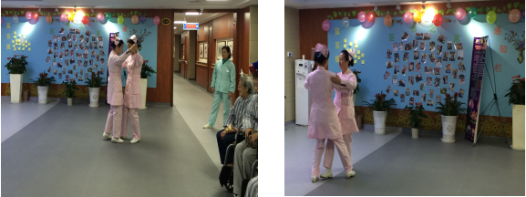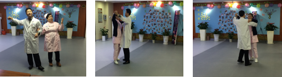 这时五病区的何主任也来了,在场全体人员都邀请主任上台表演,当然主任也不负众望一连表演了俩个节目,和卞老师演唱了一首《我的中国梦》,感恩祖国美好的今天,感恩老人们为建设新中国而付出的血和汗。和护理部主任左老师跳了一支男女搭配的双人华尔兹。