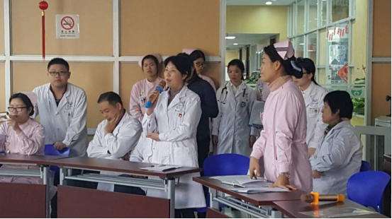 二病区护士按预案程序扮演不同角色,针对设定的场景和发生的事件的上报等进行现场模拟表演。整个现场紧张、严肃、有序。