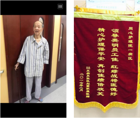 88床的张臣彪爷爷在我们病区已经住了一年了,在这段时间里他感受到了我们对他的关心与爱护及细致周到的护理,我们都亲切的称他为老张,他既是我们的长辈,又是我们的朋友。患者亲手提笔的话语做成了锦旗送予了我们病区,这是对我们病区的鼓励与肯