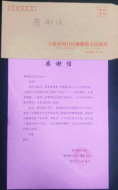 梅陇镇文明办、梅陇镇社区志愿服务中心代表上海同心护理院及今后受益的老人送上感谢信,感谢沈女士的慷慨捐赠,感谢沈女士对梅陇地区“讲文明、树新风”工作的支持和认同。
