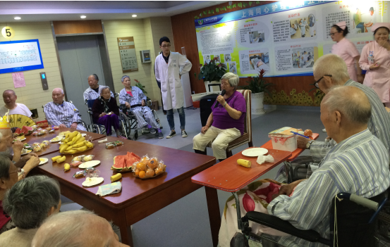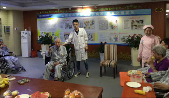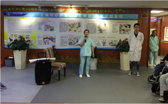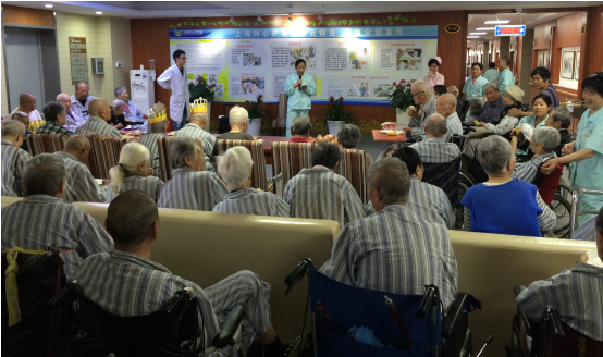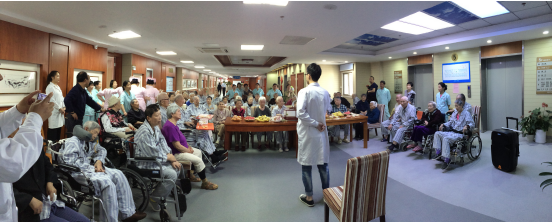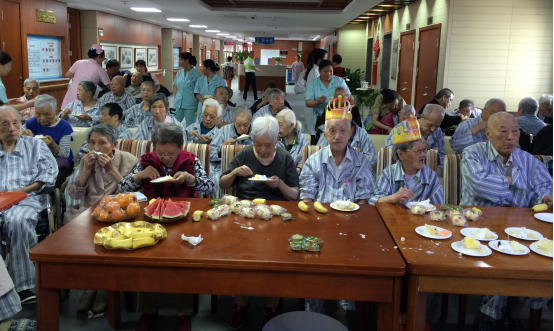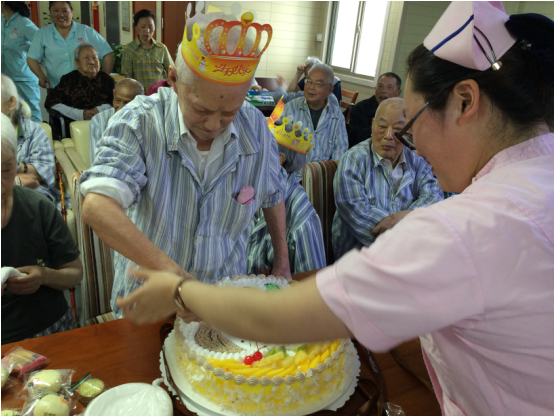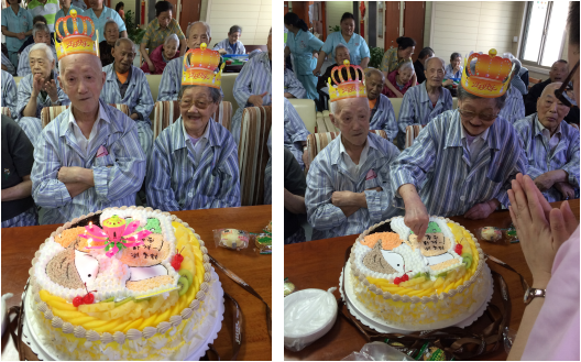 午睡过后就看到五病区的护士们一个个喜气洋洋的忙来忙去,问过才知道今天有两件喜事:一是母亲节,二是百岁夫妇的生日会,每个人都笑容满面的做着准备。活动在14点准时开始,由五楼的康复师主持。先给百岁夫妇点上蜡烛、唱起生日歌,寿星夫妇许愿切蛋糕。送给在场的每所有老人人手一份小蛋糕,一起分享他们的喜悦,庆祝寿星的诞辰。
