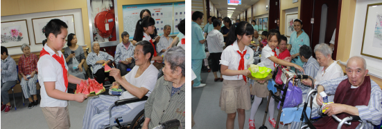 老师和家长看着小朋友在现场的表现,纷纷表示顶着高温来是值得的,暑假里小朋友在家不是玩电脑就是看电视,过的很没有质量,来到同心护理院探望老人,让小朋友们对敬老爱老有了实际的参与,而不仅仅是口号。