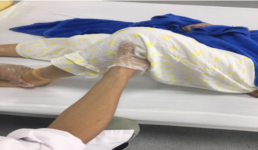 患者平躺在床上,患侧(也就是偏瘫侧)靠近床边,家属用一只手轻握脚踝,另外一只手拖住膝盖窝,要求患者主动用力,蜷腿。患者蜷腿时,脚后跟要一直挨着床面,不能抬起;蜷腿时要保持“正上正下”,不可左右晃动;患者要主动用力,家属在患者用力不足的情况下,适当加以辅助。患者平躺在床上,蜷腿,膝关节弯曲至90度;患者家属一只手托住其患侧脚底,同时让患者做“勾脚尖”的运动。勾脚尖时,脚尖要朝外上方勾。