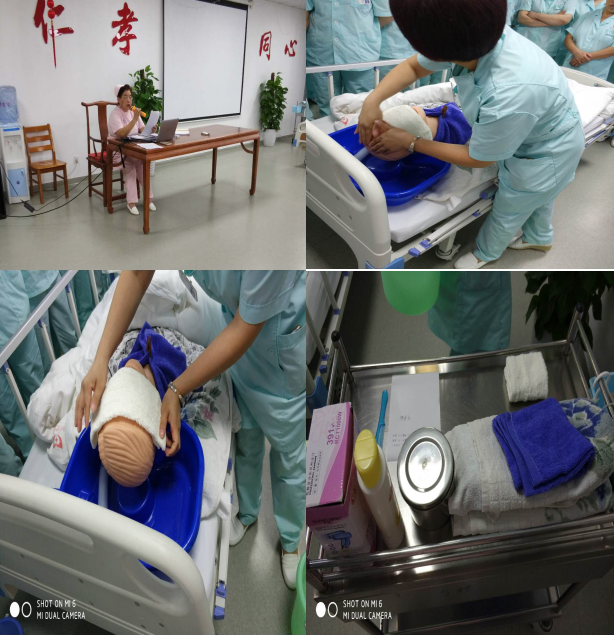 授人以鱼不如授人以渔的意思是说,你给一个人一条鱼,不如教会他捕鱼的技术,因为你给他一条鱼,他吃了或者卖了就没有了,帮助可能就是暂时解决问题;而你教会了他捕鱼的本领他就可以自己捕鱼充饥果腹或者换钱置物,能帮助他从根本上解决问题。同样我们护理院定期会培训护工们一些专业护理技能,就如今天的床上洗头来说,从老人身体状况的判断、水的温度、毛巾的使用…每一个细节都体现对老人的尊重和关爱。我们为什么不止一次的去培训大家,是大家不会做吗?床上洗头是在坐的护工都做过也都会做,但对比梁老师的示范操作,你们能感觉到自己的差距吗?没有对比就没有差距,没有差距就没有进步的空间。我们隔一段时间就送护工外出培训,取得的相应健康照护证书全国通用,我们不仅给你们提供一个就业的机会,还教会你们一些过硬的护理技能,我们很自豪的讲你们走出去都是社会的人才,你们也是构建和谐社会的一份子。你们在这里既可以拿到理想的工资,又学到了真本领,首先应该感谢医院给你这个平台。人是应该感恩的,感恩你的父母把你带到这个和平年代,感恩党和政府的养老政策,同时我们也感谢梁老师今天又教会大家规范的床上洗头法。