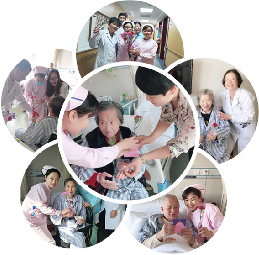 5个病区的科主任、护士长带领这院办的干部把一份份饱含祝福的礼物送到每一个老人的手里。