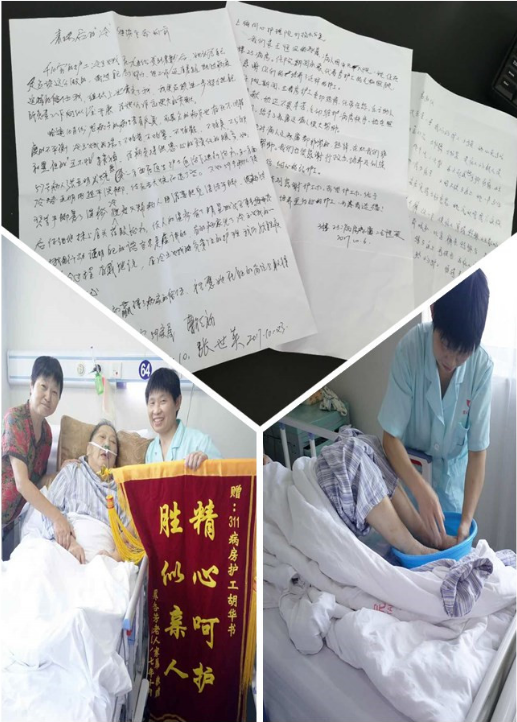 三病区的护理员胡华书,日常工作细致、细心得到了病房内全体病人和家属的好评,在病区也是有口皆碑的优秀护理员。其他护工向她取经,“怎么能做得像你一样好呢?”,胡阿姨很不好意思,和大家分享了她的工作心得:住院的老人子女工作都很忙,没有很多的时间来陪伴他们,我自己的父母在老家没有办法陪伴他们,我就把他们当做自己的父母长辈,多心疼他们一点,做任何事都当做为自己的家人。