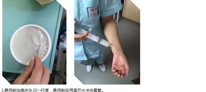 2.鼻饲液应现用现配,温度在38℃~40℃之间,打鼻饲前用手 掌内侧试温度。